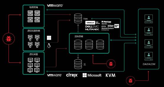 方案整体设计从互联网接入安全、移动办公安全、区域间数据交互安全、分支机构互联互通安全等多个方面,围绕网络安全、主机安全、数据安全、应用安全多个维度构建整体安全解决方案,实现对企业数据中心全方位立体化的安全防护。